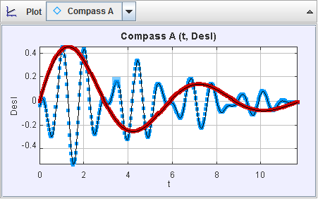 Displacement versus time for the coupled spring-mass model and the coupled compasses video. In the model energy is conserved. |